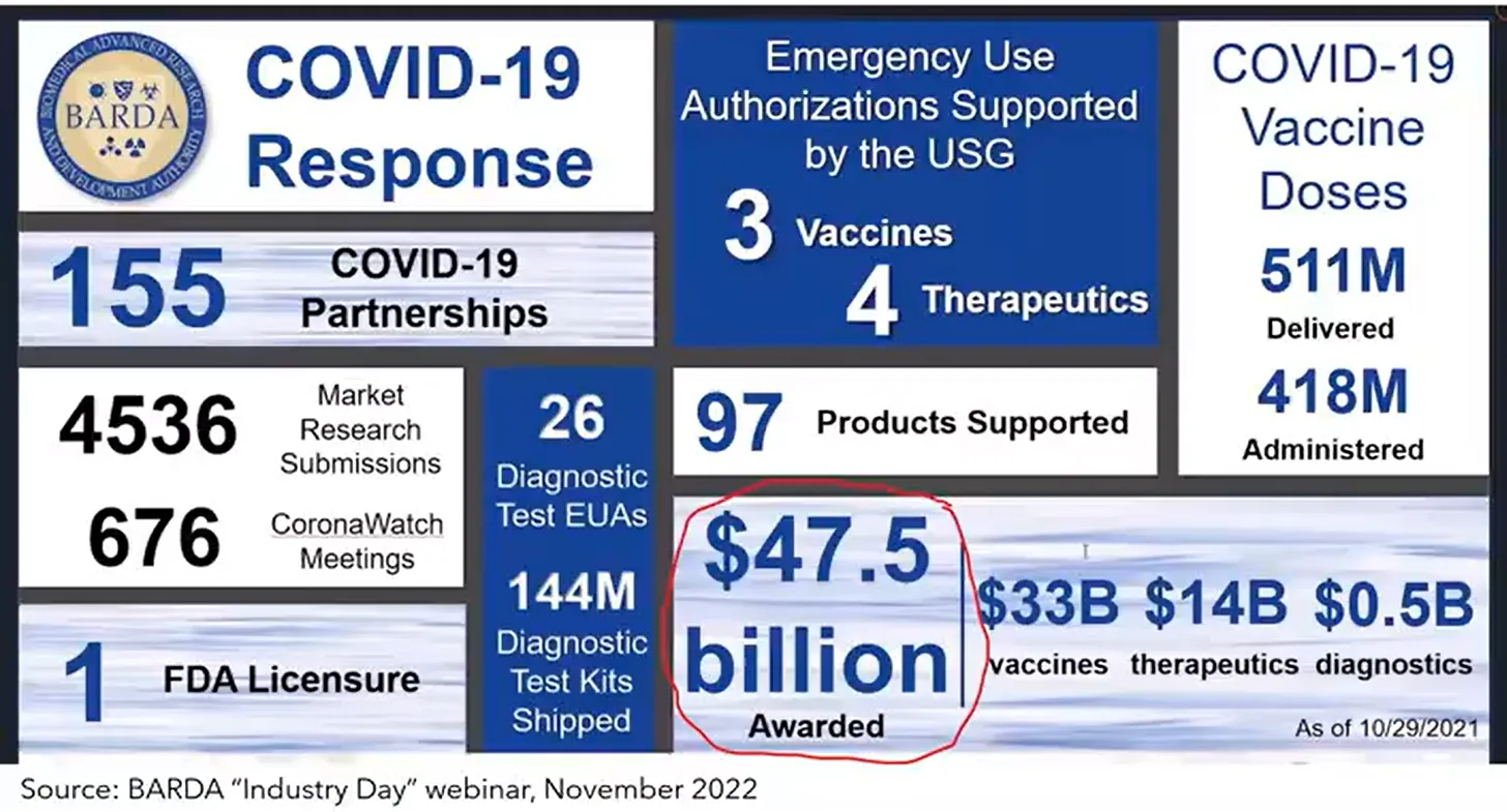 Aufgrund dieser Vorgehensweise behauptete die BARDA, es könne die klinischen Versuche mit der COVID-Injektion parallel zur Herstellung der experimentellen Substanzen abwickeln. Latypova merkt jedoch an, dass „dies eigentlich ein Verstoß gegen die Vorschriften der Herstellungspraxis ist, die in Titel 21 des Bundesgesetzes verankert sind. Und dieser Code of Federal Regulation wurde eigens geschaffen, um genau das zu verhindern“. Latypova fügt hinzu: „Es ist nicht möglich, sichere Produkte herzustellen, bevor die Sicherheit ordnungsgemäß getestet wurde“. Außerdem, so die Pharma-Veteranin, habe die BARDA behauptet, dass sie die Qualität der Injektionen reguliere und nicht die FDA. Das ist nicht nur deshalb absurd, weil sie sich nicht wie eine Regulierungsbehörde verhalten sollte, sondern auch, weil BARDA die eigentlichen Hersteller der Injektionen finanziert hat.Latypova zeigt gegen Ende ihres Vortrags, dass die BARDA im Laufe vieler Jahre verschiedene Pharmaunternehmen und Nebenorganisationen mit 47,5 Milliarden Dollar finanziert hat, darunter 33 Milliarden Dollar für Impfstoffe. Ohne diese Finanzierung, so Latypova weiter, wären viele dieser Unternehmen nicht einmal profitabel gewesen und hätten nicht in die Produkte investiert, die sie entwickelt haben.